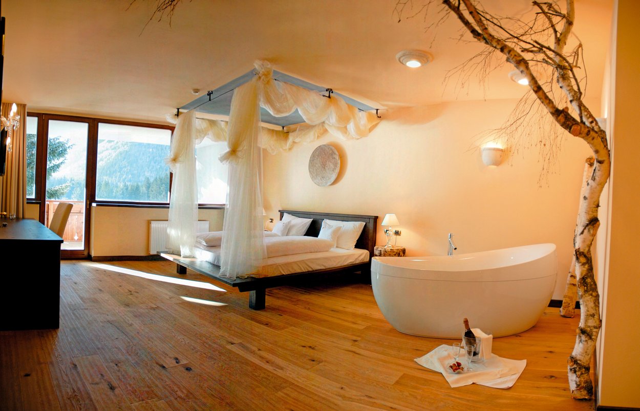Stile norvegese, rustico, romantico, sportivo, giapponese o da bivacco? Qualunque sia la suite tematica per cui opterete, potrete essere certi del massimo livello di comfort: le camere, arredate in base allo stile prescelto, sono dotate di balcone che affaccia a sud, soggiorno e camera da letto, bagno (in alcune camere aperto), vasca e doccia, 1 o 2 TV a schermo piatto, minibar, cassetta di sicurezza, WiFi gratuita e molte altre caratteristiche.
